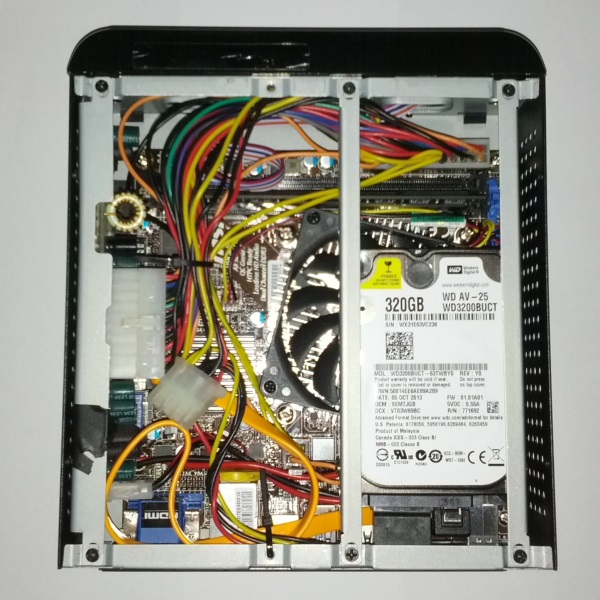 While the internal power supply was not made for my specific case, after a bit of modifications, I made it fit. the CPU fan was just short enough to fit and allow room for the 2.5″ Western Digital USB drive. So I put it all together and powered it up.